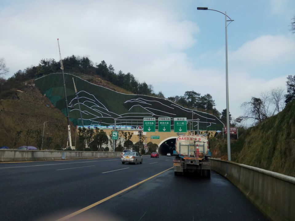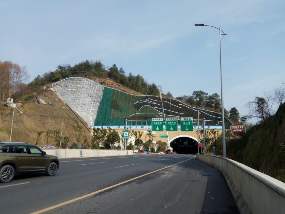 3、隧道口上方邊坡運用國畫中白描手法將貴州獨特的山、水、田園風光巧妙的融為一體,運用不同色彩的植物劃分,塑造層次豐富,立體感的垂直綠化景觀。